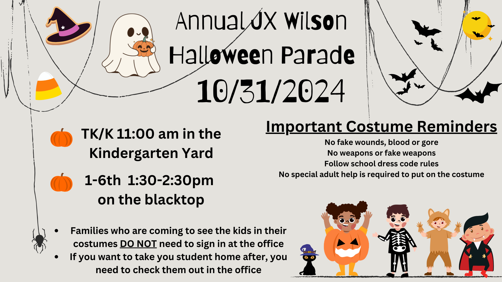 The annual J.X. Wilson Halloween Parade is on Thursday, October 31st. There will be two parades, one for TK & K and another for upper grades. Parents are invited to attend. Please remember that students should not wear their costumes to school. They will be able to change before the parade. Costumes should be able to go over the clothing worn to school.